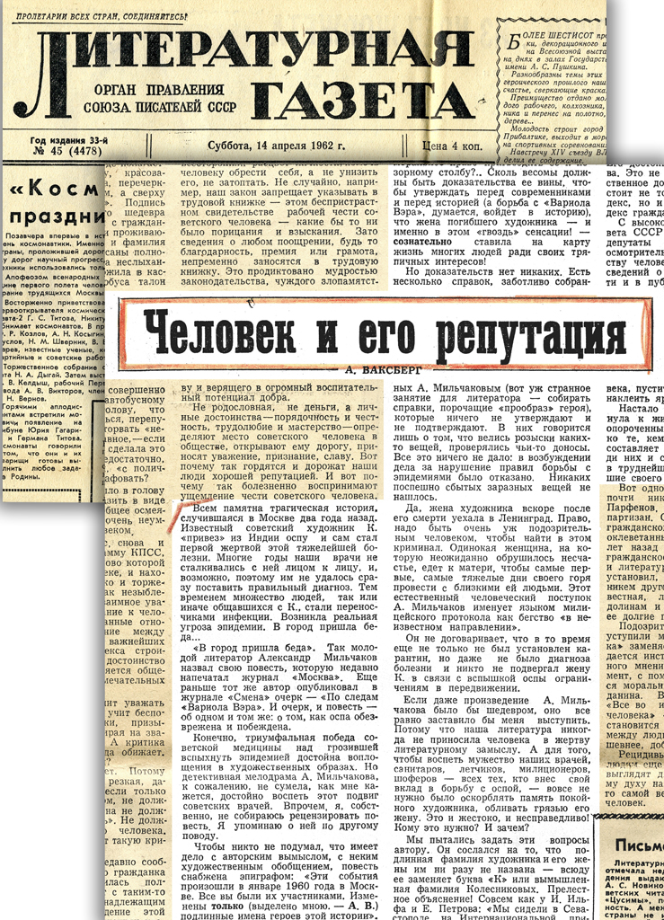 И чтобы сразу обозначить остроту темы, в течение последующих нескольких лет не сходившей со страниц газет и бурлившей в сознании современников, начну с отрывка из статьи Аркадия Ваксберга. Статья называлась «Человек и его репутация» и была опубликована в «Литературной газете» от 14 апреля 1962 г. № 45 (4478).