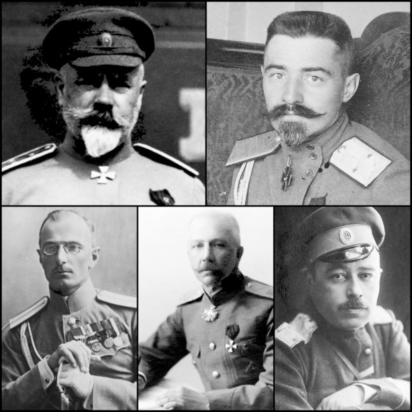 Великие Белые генералы (слева направо): А. Деникин, С. Марков, М. Дроздовский, П. Краснов, А. Дутов