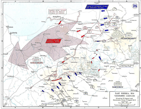 Армии Северо-Западного фронта вторглись в Германию, имея целью отрезать немецкие корпуса от Вислы и овладеть Восточной Пруссией. Армии наступали, имея между собой большие интервалы, по обе стороны Мазурских озер…