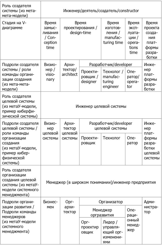 Труд обучения/teaching – это извод инженерного труда (а именно – инженерии личности, обучаем личность новому мастерству), он меняет физический мир (создаёт в нём мастерство, реализованное каким-то материальным агентом, меняющим своё поведение). Занимается этим трудом роль учителя/педагога/андрагога (и точно так же мы перетрактуем роль, например, психолога – это учитель нового поведения) как специализация роли инженера. Как и роль инженера, которая делится на подроли со своими уникальными практиками в большинстве проектов, так и роль учителя тоже делится на подроли со своими специфическими практиками. Напомним табличку соответствия ролей инженера, менеджера, учителя с их разбиением на подроли, которая приводилась в курсе системного менеджмента, а в нашем курсе инженерии личности мы дадим больше подробностей: