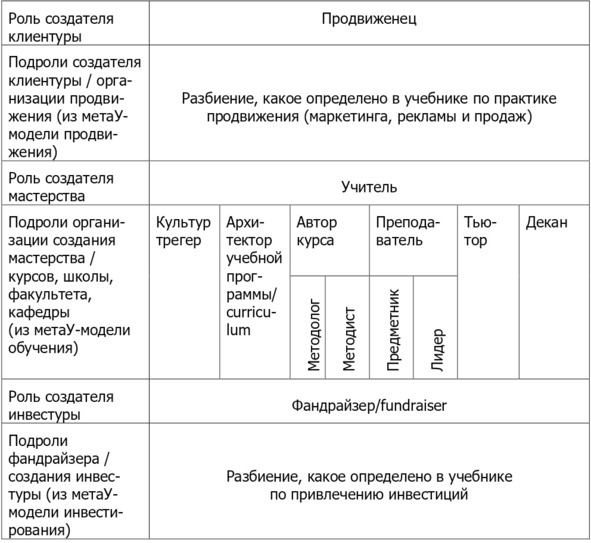 Учитель как верхнеуровневая роль провайдера обучения проектирует/design целевое мастерство (или занимается reverse-engineering: берёт «стихийного мастера» в жизни и восстанавливает проект/design мастерства из него), разрабатывает учебные материалы (объяснения, задачи), набирает из абитуриентов студенческую группу, проводит занятия куррикулума/учебной программы, помогает студенту с учебной нагрузкой, поддерживает администрирование учебного процесса.