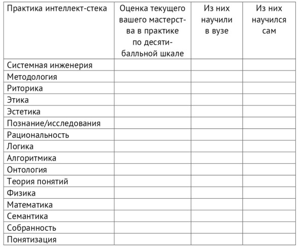 Оцените по десятибалльной шкале, насколько вас научили мыслительному мастерству в вузе, и сколько вы добавили самообразованием (в сумме 10 баллов на вуз+самостоятельное изучение). Это ничего, что вы не очень понимаете пока содержание трансдисциплин интеллект-стека: попробуйте догадаться по тем функциональным объектам, которые являются предметом этих трансдисциплин. Дальше в курсе будут приведены краткие пояснения по каждой трансдисциплине, но сначала попробуйте оценить, насколько вы владеете культурой современного мышления, практиками интеллект-стека.