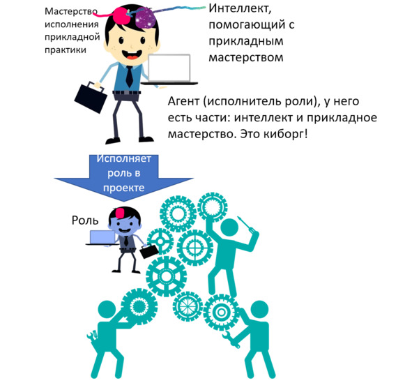 Вы заходите в комнату с работающими людьми, вы хотите разобраться в том, что они делают. Системное мышление подсказывает: эти люди занимаются какой-то системой, выясни у них, какой. Это и есть «проект» по созданию и развитию какой-то системы. Ты выясняешь – ибо если это атомная электростанция, то это один разговор, а если вечер фортепианной музыки – то разговор будет совершенно другой. Все эти люди в проекте по поводу этой системы играют какие-то роли и выполняют какие-то практики, и вы быстро ориентируетесь, с кем о чём разговаривать и как их заинтересовать в ваших проблемах. Методология позволяет внятно описать саму деятельность, а не мычать что-то на эту тему. Системное мышление подсказывает: они тут сидят в том числе и потому, что какие-то внешние по отношению к этому проекту люди играют какие-то внешние проектные роли. Вы интересуетесь этим, и становится понятно, зачем эти собравшиеся в комнате люди собрались, что они делают, вы можете как-то предсказать результат проекта и принять решение о вашем дальнейшем участии.
