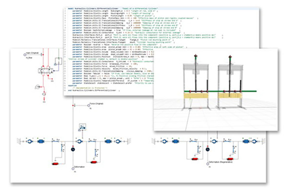 1D-моделирование довольно долго делалось на акаузальных языках моделирования, например, Modelica35, одновременно с графическим и текстовым представлением систем алгебраических дифференциальных уравнений. В физическом системном моделировании учитывается уже более-менее разная физика системы (механика, гидравлика, энерготеплопереносы и т.д.) или какие-то её другие свойства (например, умение производить работы, пропускать через себя поток предметов работ – иногда это называют даже factory physics). Но это всё моделирование функционирования, по факту – это моделирование метода работы системы. Вот пример представления модели на Modelica36: