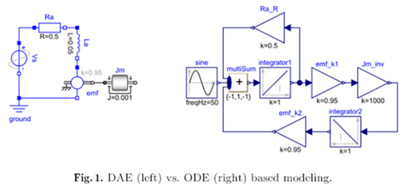 Но как же проходит такой трюк с переходом от ODE к DAE? А вот так: разные уравнения собираются в большую систему из сотен, или даже тысяч (а в последнее время речь идёт и о миллионах) дифференциальных уравнений, и дальше решением этой огромной системы уравнений занимается компьютер (или даже суперкомпьютер, если система реально большая). Вот сравните удобство для инженеров моделирования электрического мотора с учётом инерции его вращения при представлении модели в DAE и ODE формах в их диаграммном виде38: