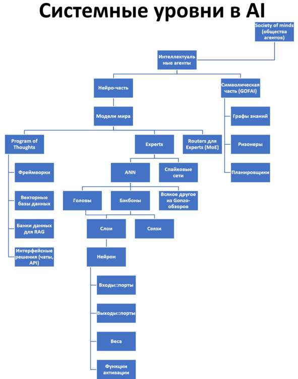 Сегодня (а про завтра ничего сказать пока нельзя) центральное место в функциональной декомпозиции систем AI занимают искусственные нейронные сети. Поглядим на очень грубо составленное дерево/аутлайн системных уровней систем AI: