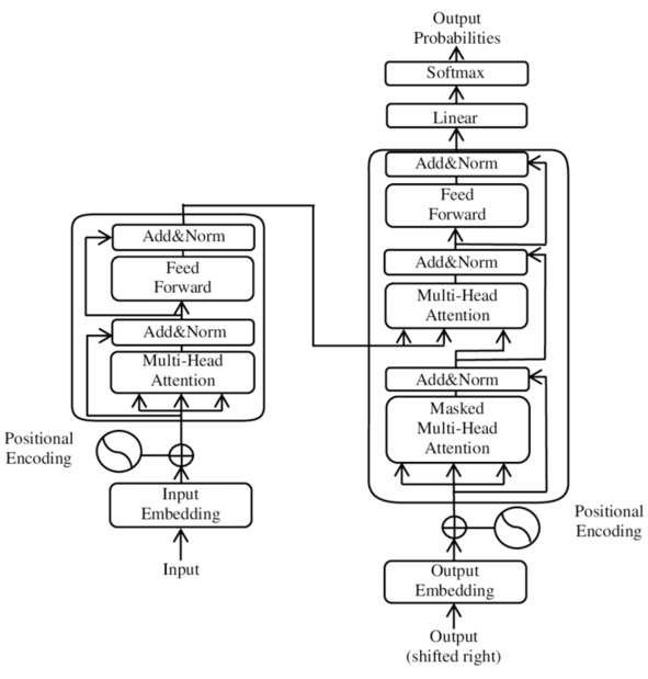 В суперупрощённом виде мы видим функциональную диаграмму: какая-то входная информация даётся на вход маршрутизатора, который выбирает пару экспертов из четырёх возможных, а затем ответы этих экспертов как-то замешиваются в выходную информацию. Вот эти «эксперты» обычно – искусственные нейронные, ANN, artificial neural network сети с классической декомпозицией на «слои» из вычислительных «нейронов»50. Вот типичная функциональная диаграмма для ANN (традиция называет такие диаграммы «архитектурами», но в этой «архитектуре» ни слова не говорится о конструктивах, это в других предметных областях было бы «принципиальная схема»), на ней представлен трансформер/transformer51 как вид ANN, отвечающий подобного сорта функциональной диаграмме, эта «принципиальная схема» была предложена в 2017 году: