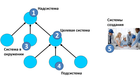 На картинке системы создания (условно изображены как оргзвено из людей) изображены отдельно от иерархии системного разбиения, это ведь вообще другое время (время создания, а не время использования/эксплуатации/функционирования/работы целевой системы, её подсистем и её надсистемы). Когда целевую систему (впрочем, и подсистему, и надсистему) создают, там будет другое рассмотрение: в центре будут какие-то из систем создания, а будущие системы находятся в неработоспособном ещё состоянии «сырья», «полуфабриката».
