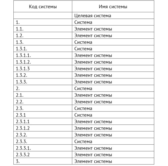 Альтернативный способ – это использовать явную нумерацию уровня как отдельный элемент списка. Вот та же структура, что в предыдущем списке, только представлена в табличной форме (например, Excel таблице). Целевая система как целая при этом в нашем варианте представления не имеет кода, а число позиций в коде – это системный уровень (1.3.1.1. – это будет четвёртый уровень, если целевая система на нулевом уровне. Как ни печально, но в стандарте ISO 15288 на картинке опечатка в нумерации уровней, четвёртый уровень показан как пятый!)