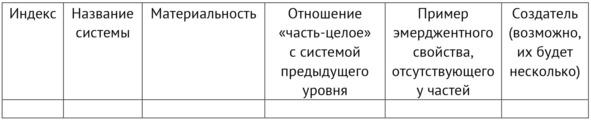Отмоделируйте системные уровни какой-то вашей рабочей системы таблично (используйте индексы, например 1.1.3.6 для четырёх уровней). Начните обязательно с надсистемы вашей системы, сама ваша система должна быть не на верхнем уровне, а на втором или даже третьем сверху. Проставьте отметки «да» прохождения простейшего чеклиста на правильность моделирования – это две колонки «Материальность» и Отношение «часть-целое» с системой предыдущего уровня» (если отметка в этих колонках «нет», надо будет исправить модель, так, чтобы отметка стала «да»).