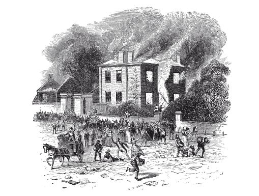 Вооруженная факелами толпа разрушает дом химика Джозефа Пристли в Бирмингеме. Эта сцена послужила прообразом многих кинематографических версий истории о Викторе Франкенштейне.
