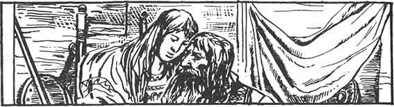 Пир продолжался долго. Отсутствие жены испортило Водану все настроение. Он едва сдерживался, чтоб не показать присутствующим своего дурного расположения духа. Уже наступила ночь, когда он отпустил гостей и прошел в покои царицы. Фригг еще не ложилась. Она сидела в глубоком кресле, полураздетая. Дважды раненная ее правая рука лежала на перевязи.