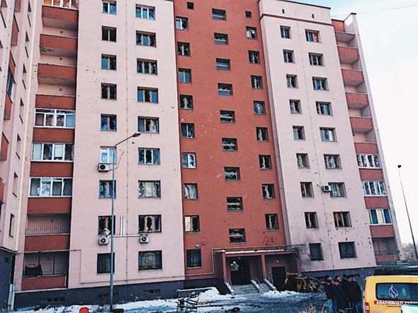 12.30. Дом по адресу Чапаева, 4. Рядом недавно построенная кирпичная девятиэтажка и несколько невысоких зданий. Все они очень сильно повреждены: ни одного целого окна, в стенах большие дыры. На асфальте битое стекло, поломанные ветки деревьев, в земле отчётливо видны воронки – достаточно крупные, зияют близко друг к другу. Из подъездов выбираются на солнце шокированные местные жители. Они до сих пор не могут прийти в себя и представить, что теперь так выглядит их родной двор. Несколько дней они просидели в подвалах без еды и воды. Мужчины раздражённо курят. Женщины, прижимая детей к себе, плачут. Некоторые очень сильно, навзрыд. Замечаю одну из них – местная жительница в лёгкой одежде с накинутым на плечи розовым халатом. Её лицо искажено болью – иначе про жуткую гримасу скорби и не скажешь. Обращаю на неё внимание оператора: «братаныч, это план дня». Очень циничная, конечно, фраза, но такая у нас работа – только тогда зритель увидит весь неприглядный ужас войны. Вот ещё один кадр: на руках спасатели выносят из дома женщину в инвалидной коляске. Невозможно представить, как она провела последние несколько дней, настолько сложно ей было.