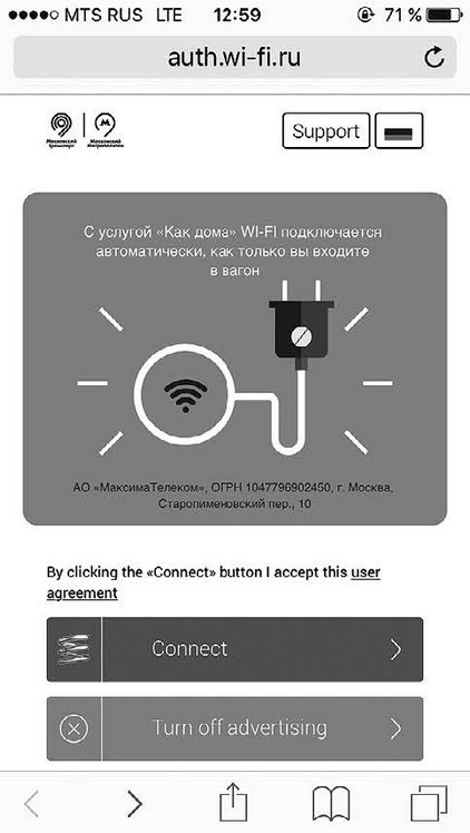Эта страница открывается, когда вы пытаетесь подключиться к Wi-Fi Московского метрополитена. Здесь вам необходимо просто нажать на табличку «Войти в Интернет». Существует много вариаций такого входа, но все они действуют по одному и тому же принципу (нажать на табличку / поставить галочку / посмотреть рекламу). Самый современный метод входа – ввести свой номер телефона, подождать некоторое время, пока вам придет СМС с кодом доступа, а затем его ввести в браузер.