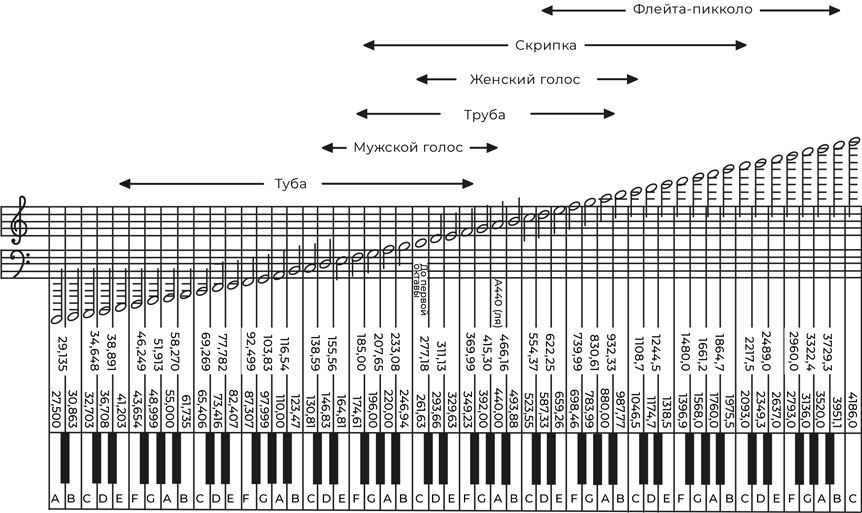 Мы условились называть звуки, которые возникают при нажатии клавиш в левой части клавиатуры, низкими, а звуки в правой части клавиатуры – высокими. То есть низкие звуки – это колебания с меньшей частотой, как, например, лай большой собаки. А звуки, которые мы считаем высокими, – это колебания с большей частотой, как, скажем, тявканье маленькой собачки. Однако сами термины «высокий» и «низкий» культурно относительны: греки описывали высоту звуков наоборот, потому что изготавливали инструменты, в которых звучащие элементы располагались вертикально. Более короткие струны и органные трубы были ниже, поэтому ноты, которые на них исполняются, называли низкими (они и физически находятся ниже), а более длинные струны и трубы тянулись ввысь к Зевсу и Аполлону, потому их ноты называли высокими. «Низкие» и «высокие» звуки, так же как «левая» и «правая» рука, по сути, произвольные термины, которые нужно просто запомнить. Кое-кто утверждает, что «высокие» и «низкие» звуки – это лишь интуитивно данные ярлыки, и отмечают, что звуки, которые мы называем высокими, издают птицы высоко на дереве или в небе, а звуки, которые считаем низкими, – крупные млекопитающие вроде медведей, а еще их можно услышать во время землетрясения. Однако этот аргумент недостаточно убедителен, так как низкие звуки иногда раздаются и сверху (вспомните раскаты грома), а высокие – снизу (вспомните сверчков, белок, шуршание листьев под ногами).