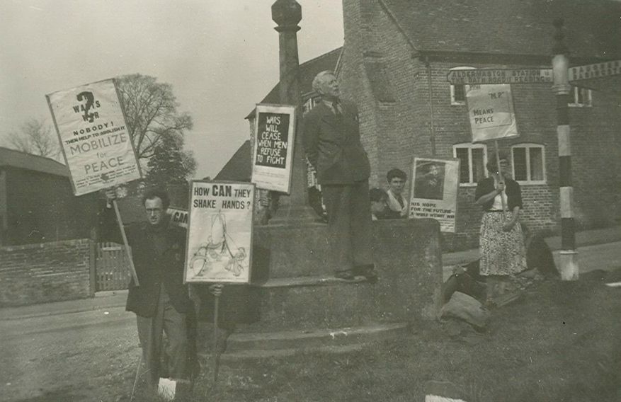 Fig 5: Stuart Morris addressing the public meeting organised by Operation Gandhi in Aldermaston village on 19 April 1952. The man on Morris’ right is Francis Deutsch. The woman holding the banner with the words, ‘His hope for the future’ is Doris Wheeler. University of Bradford, Special Collections, Cwl HBP 1/5.