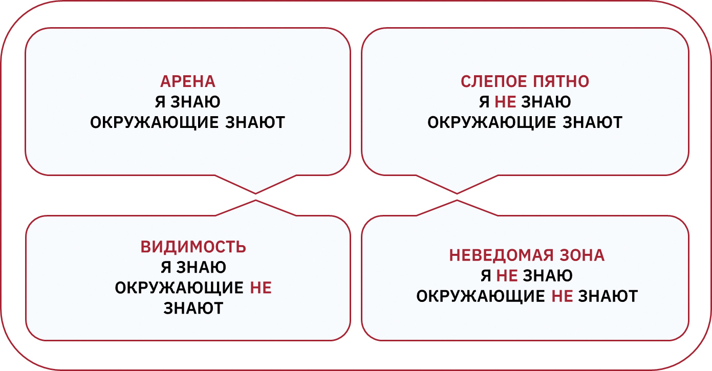 В каждом человеке есть открытая зона (Арена), скрытая зона, слепая зона, неизвестная зона. Арена представляет ту часть личности человека, которая известна как самому человеку, так и окружающим. Слепое пятно соответствует той части личности, о которой знают окружающие, однако о ней не знает сам человек. Скрытая зона – это часть личности, известная самому человеку, но неизвестная окружающим. А неведомая зона – это то, что неизвестно о личности ни самому человеку, ни окружающим.