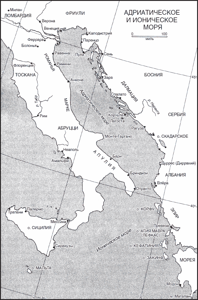 Верхнюю Адриатику и в целом часть моря, изначально игравшую жизненно важную для Венеции роль, можно отметить условной линией, соединяющей Пулу – город на южной оконечности полуострова Истрия – с Равенной (см. карту 1). Именно эту часть Адриатики принято было называть Венецианским заливом. Вскоре стало ясно, что в Венецианском заливе может властвовать лишь одна морская держава. С ослаблением византийского флота, чьей основной базой служила Равенна, роль представителей Византии и защитников мирной торговли перешла к венецианцам. Упрочение власти в Венецианском заливе связано с правлением дожей из семьи Кандиано, которые правили Венецией почти весь X век. Пьетро II Кандиано (932–939) подавил сопротивление Комаккьо. Оправившись после более раннего разграбления, жители этого соседнего города начали угрожать венецианской торговле. Кроме того, Пьетро II Кандиано захватил Каподистрию на другом берегу Венецианского залива. Когда жители других городов на полуострове Истрия, которыми правил местный князь, начали грабить венецианские суда, дож запретил вести торговлю с этими городами и тем самым поставил их на колени, лишив их соли и прочих предметов первой необходимости. Его сын, Пьетро III Кандиано (942–950), также успешно применил экономический бойкот в споре с Аквилеей. Экономическое, а не только военное принуждение доказывает, что венецианцы еще в X веке занимали главенствующее положение в той области в торговле и судоперевозках. Не все земли на побережье так называемого Венецианского залива подчинялись политической власти Венеции, но после падения Равенны ни один близлежащий город не способен был выставить военно-морской или торговый флот, способный соперничать с венецианским.