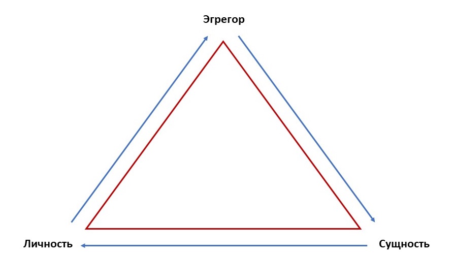 Полноценно ни одна из ипостасей Треугольника не может существовать без двух других. И хотя эгрегор имеет превалирующее значение в этом взаимодействии, он не мыслим без людей. В то же время, без сущностей эгрегор быстро исчезает, т.к. они обеспечивают его устойчивость во времени через связь прошлых и нынешних поколений. Сущность «живет» в рамках своего эгрегора, без него она «умирает». Это важно понимать при создании или сломе того или иного эгрегора.