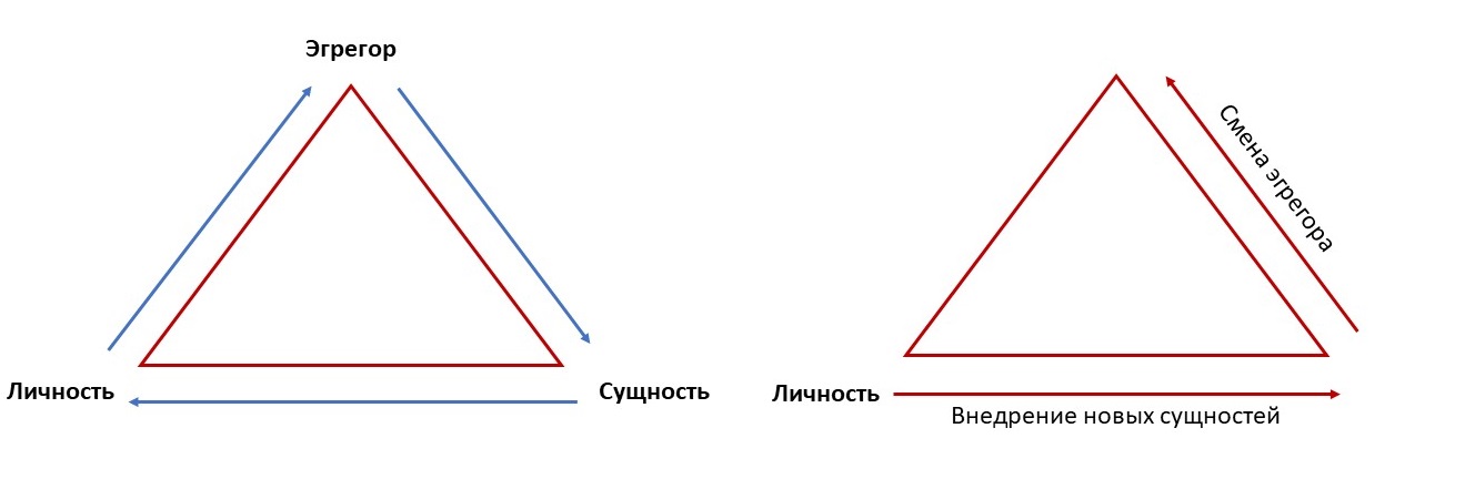 Например, когда сильная личность намеревается сформировать вместо старого новый эгрегор, она не должна идти в лоб против существующего, т.к. в этом случае её просто перемелет сопротивление социума. Её действия должны осуществляться опосредованно, через внедрение в общественное сознание новых сущностей, которые впоследствии произведут замену эгрегора. Другими словами, необходимо запустить вспять взаимодействие в треугольнике.