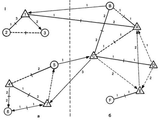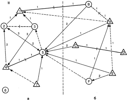 После графического представления результатов социометрического теста в социограмме можно приступить к его качественной оценке. Социометрические структуры на социограмме изучаются теперь подобно структурам органов тела на рентгеновском снимке. Если мы исследуем социограммы I и II нашего примера, т. е. небольшого предприятия с двумя его подразделениями (а) и (б), то на обеих социограммах мы увидим одних и тех же участников, но совершенно разные cоциометрические структуры. Эти различия основываются на разности критериев, положенных в основу теста.