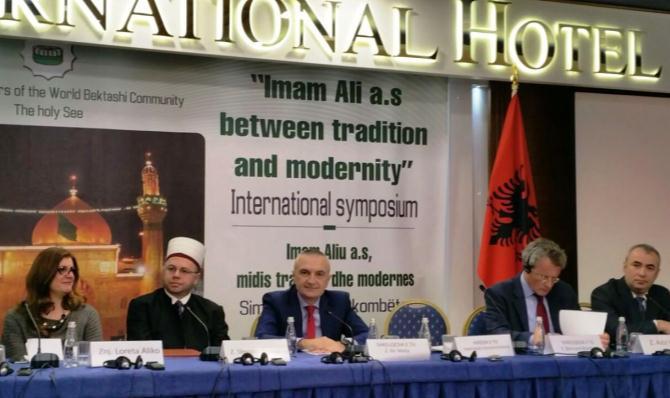 Sənədli filmdən sonra Dünya Bəktaşilərinin Baş Dədəsi Edmond Brahimay (İbrahim) simpozium iştirakçılarını, qonaqları, nazirləri və prezidenti salamladı. Dünyadakı bəktaşilərin bugünkü vəziyyətindən, onların Həzrət Əliyə olan sevgisindən, Həzrət Əli ideyalarını yaşatmalarından, bu ideyanın dünyaya sülh və əminamanlıq, bolluq və bərəkət gətirəcəyindən söz açdı. Sonra ATƏT-in Albaniyadakı böyük elçisi Bernard Borcharda, Albaniya Müsəlmanları Komitəsinin sədri Skendern (Biz “İskəndər” kimi tələffüz edir və yazırıq – Ə.Ş.) Bruçaya, Albaniya Dini Qurumlarla İş Komitəsinin sədri Loreta Arikaya çıxış etdi. Açılış toplantısının sonunda Albaniya prezidenti İlir Meta danışdı. Bu mənim diqqətimi çəkdi. Çünki keçmiş Sovetlər Birliyində daha yüksək vəzifəlilərə toplantının önündə söz verilməsi bir protokol qaydasına çevrilmişdi.