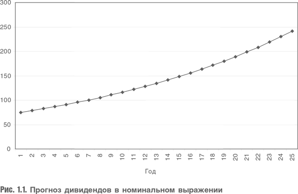 Проблема заключается в том, что каждый прогнозируемый показатель больше предшествующего. Но решение есть. Если ставка дисконтирования больше темпа роста, то дисконтированный поток дивидендов к текущим (приведенным) значениям будет уменьшаться (рис. 1.2).
