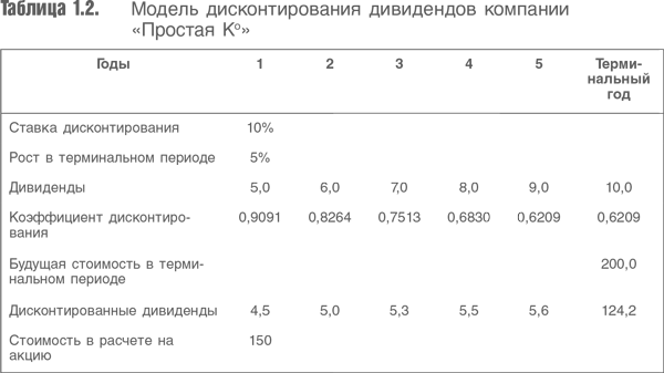 В табл. 1.2 приведена оценка компании «Простая К°», которая выплачивает дивиденды, возрастающие за следующие пять лет с 5 до 9 (очевидно, этот рост не соответствует постоянной ставке, выраженной в сложных процентах), а затем растущие на 5 % в год с базового уровня 10 в шестом году. Поскольку год 6 используется в качестве базы для оценки всех дивидендов, выплачиваемых в этом и всех последующих годах, его часто называют «терминальным» годом. Если мы применяем модель Гордона (модель роста), то при ставке дисконтирования 10 будущая оценка конечной стоимости составит 200. Это означает, что стоимость акционерного капитала компании «Простая К°» через пять лет будет составлять 200. Однако нас интересует текущая оценка. Поэтому нам потребуется пять множителей дисконтирования дивидендов отдельных лет и конечной стоимости. Стандартная формула дисконтирования стоимости выглядит так: