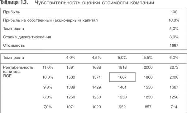 Рассмотрим пример. В табл. 1.3 показана оценка стоимости в расчете на акцию для базового случая и влияние темпа роста и доходности дополнительного капитала на стоимость. В качестве базового случая примем: доходность в расчете на акцию – 10 %, темп роста – 5 % и ставка дисконтирования – 8 %.