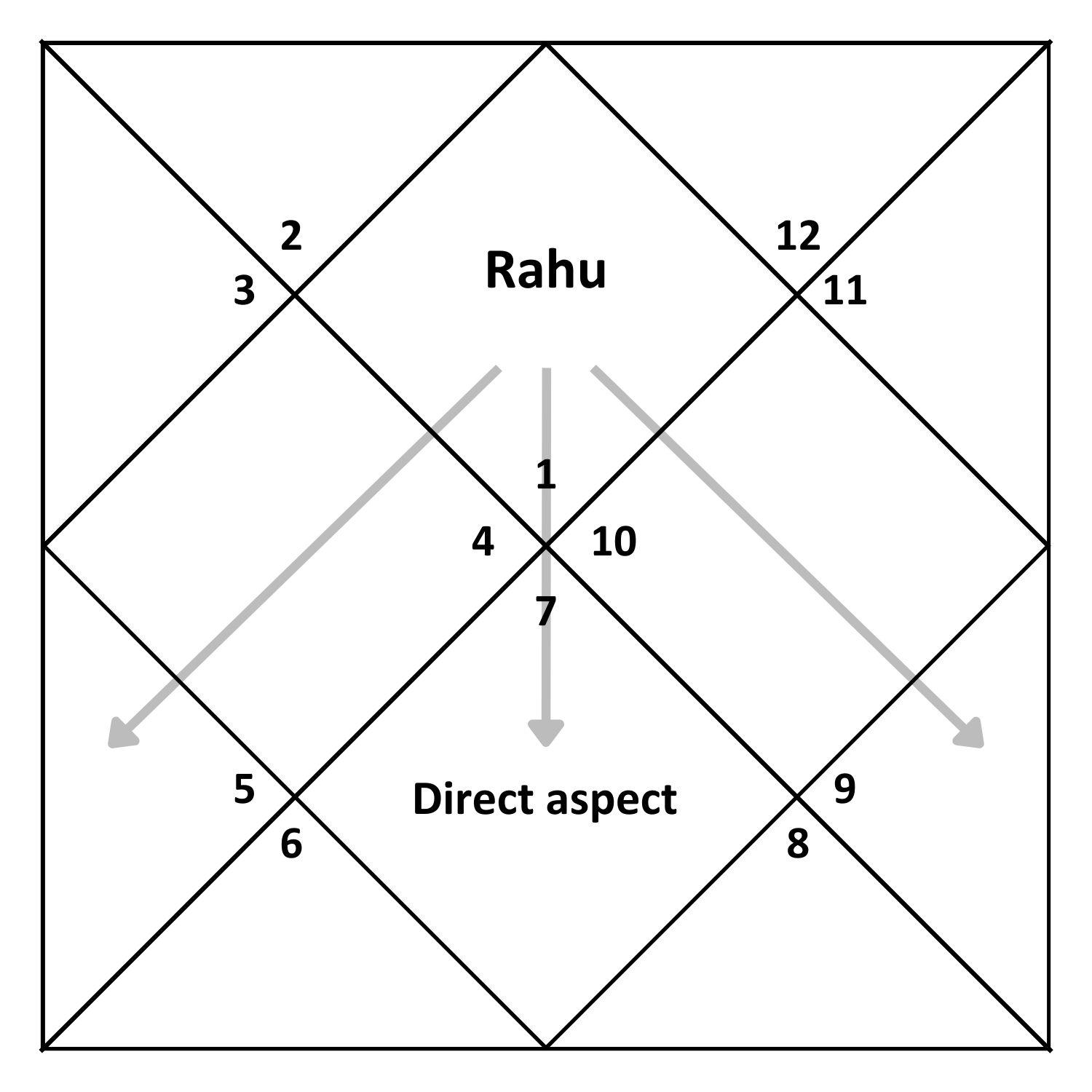 Ketu does not cast aspects—meaning it does not "glance" at other planets—since it has no head and no eyes, as it strives for Moksha (liberation). Rahu aspects the 7th, 5th, and 9th houses from its position.