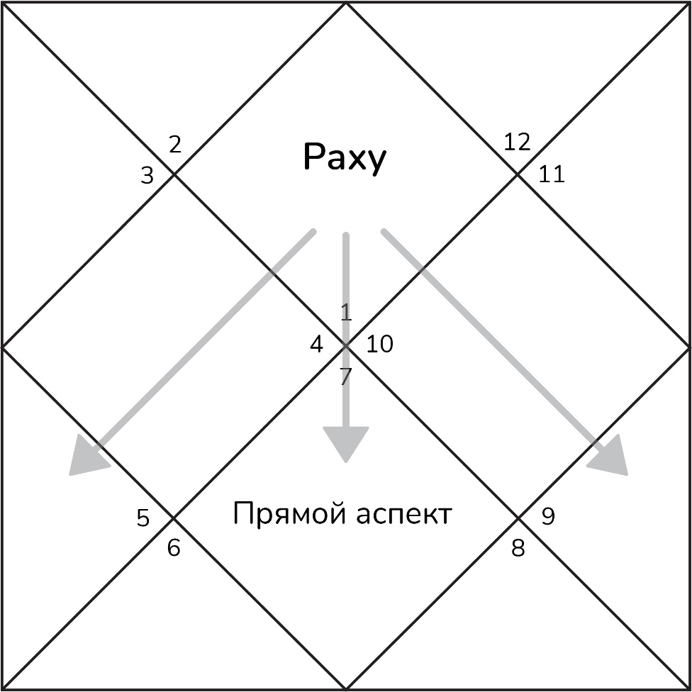 Раху даёт прямой аспект на седьмой дом от себя (у вас это пятый дом), а также аспектирует пятый дом от себя (у вас это третий дом – короткие поездки, младшие братья и сёстры, соседи, окружение, писательство, искусство, всё, что создаёте своими руками) и девятый дом от себя (у вас это седьмой дом – партнёр по браку или бизнесу).