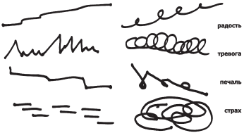 Рис. 3. Линии, графически передающие различные оттенки эмоциональных состояний (радость, печаль, тревога, страх), соответствующих слову «настроение».