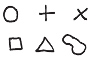 В результате исследования около двух миллионов «почеркушек», или непроизвольных, спонтанных графических изображений, собранных у детей в возрасте от двух до восьми лет, ведущий специалист в области анализа детских спонтанных рисунков Рода Кэллог разработала классификацию первичных геометрических паттернов, или базовых начертаний (Kellogg, 1979). Все многообразие обнаруженных базовых начертаний, среди которых можно назвать точку, вертикальные и горизонтальные линии, арки и прочие геометрические паттерны, Кэллог объединила в шесть базовых форм, названных диаграммами. В набор диаграмм вошли все основные геометрические формы, такие как треугольник, квадрат, круг, греческий крест, перекрещенные линии и замкнутая кривая. Многочисленные исследования, проведенные в разных странах (см. Либин А.В., Либин В.В., 1994), подтвердили обнаруженную закономерность на основе анализа рисунков детского творчества (см. рис. 4).