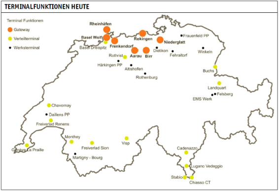 Im Import nehmen KV-Verkehre, insbesondere von und zu den Meereshäfen, eine wichtige Stellung ein. Sie machen im Import und Export einen Anteil am Aufkommen von über 30% aus, während er im Binnenverkehr bei nur 3% liegt.30 Dabei werden diese Verkehre heute in verschiedenen, dezentralen Terminals in der Nordwestschweiz abgewickelt (vgl. Abbildung 10). Danach werden sie entweder auf die Strasse umgeladen, im sogenannten Swiss Split ins EWLV-System integriert und direkt zu den Anschlussgleisen der Empfänger transportiert oder zu den regionalen Verteilterminals weiterbefördert. Es ist geplant, in Basel das Gateway Basel Nord als zentralen Hub für Import-/Exportverkehre zu bauen, um die an ihre Grenze kommende Terminalkapazität zu vergrössern, worüber am 29.11.2020 in Basel-Stadt abgestimmt wird (vgl. Kapitel 9.6).