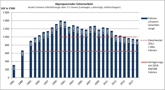 1994 wurde die Alpeninitiative in einer Volksabstimmung angenommen. Im anschliessenden Gesetz wurde festgelegt, dass der Strassentransitverkehr 2009 (später auf 2018 verschoben) auf maximal 650`000 Fahrten reduziert werden muss. Grund war die stark steigende Umweltbelastung entlang der Gotthardverkehrsachse im Alpenraum in Folge des schnell zunehmenden Strassengüterverkehrs nach dem Bau der Gotthard-Autobahn mit dem Strassentunnel.