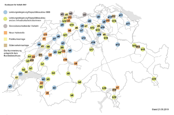 Für das aktuelle Eisenbahnpaket, den Ausbauschritt 2035, wurden 2019 12,89 Mia. Franken bewilligt (vgl. Abbildung 11). Für den Güterverkehr soll ein Ausbau der Trassen und insbesondere der Expresstrassen für kürzere Transportzeiten resultieren. Damit soll schweizweit ein Güterexpressnetz aufgebaut, auf der Ost-West-Achse der Halbstundentakt und die Einschränkungen während der Hauptverkehrszeiten des Personenverkehrs reduziert werden. Die meisten Ausbauprojekte dienen jedoch vor allem dem Ausbau der Angebote im Personenverkehr.
