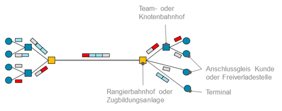 Im EWLV werden einzelne Wagen oder Wagengruppen transportiert. Dabei werden die Wagen verschiedener Kunden eingesammelt und in Rangierbahnhöfen zu Zügen mit dem gleichen Bestimmungsort zusammengestellt. Am Bestimmungsbahnhof werden die Züge zerlegt und die einzelnen Wagen auf die jeweiligen Kunden verteilt (vgl. Abbildung 8).