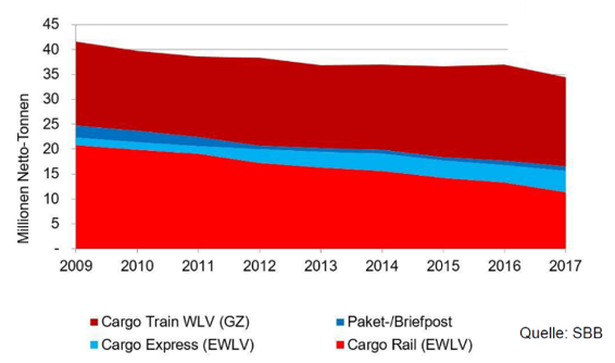 Seit Mitte der 2000er-Jahre nehmen die im SGV in der Fläche transportierten Mengen nicht nur relativ zur Strasse, sondern auch absolut ab, besonders im EWLV (vgl. Abbildung 2 auf Seite 10 und Abbildung 15: Hellrot und hellblau entspricht dem EWLV). Was sind die Ursachen dafür? Zum einen haben sich die Trends der letzten Jahrzehnte in Richtung kleinerer Sendungsgrössen, kürzeren Lieferzeiten und mehr Flexibilität durch das Aufkommen des Online-Handels verstärkt fortgesetzt, wo die Eisenbahn tendenziell weniger stark ist. Zudem sind weitere bahnaffine Industriebetriebe, die schwere Güter in grossen Mengen regelmässig transportiert haben, aufgrund der hohen Produktionskosten in der Schweiz abgewandert. Nach Nicolas Perrin hat der erstarkte Franken und die Marktöffnung Europas diesen Prozess nochmals massiv beschleunigt. Auch die anderen Interviewpartner sehen die strukturelle Veränderung der Industrie als einen der wichtigsten Gründe für den Mengenrückgang an.