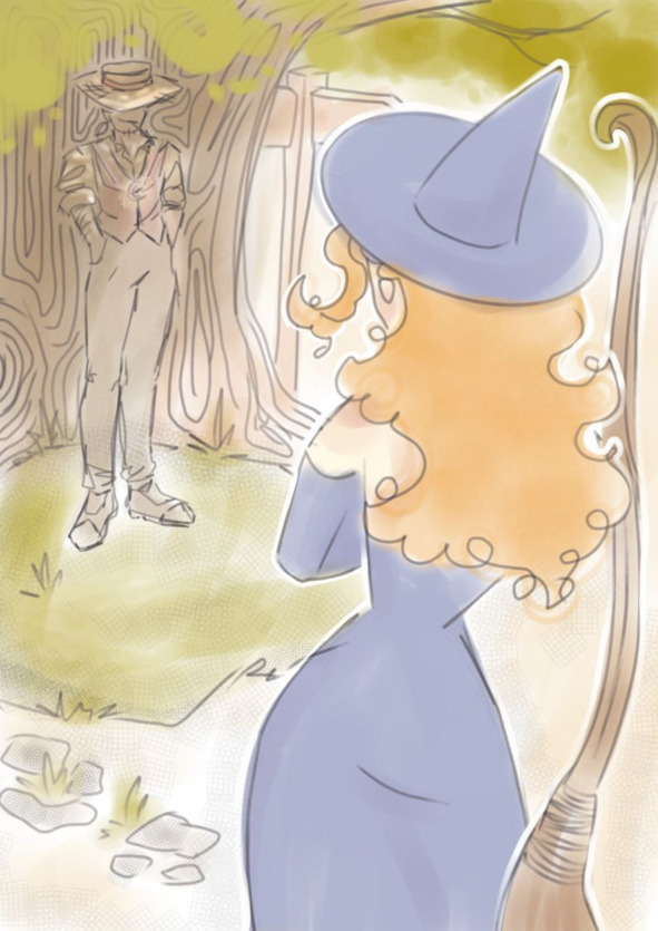 Слетела она вниз и оказалась на перекрёстке трёх дорог. Там, в тени раскидистого дуба, сидел тощий неприметно одетый человек. В одной руке он держал колоду карт, а в другой – сверкающий золотой кулон. Даже в тени он не утратил своего чарующего блеска. Кулон был выполнен в виде летящей на метле ведьмы.
