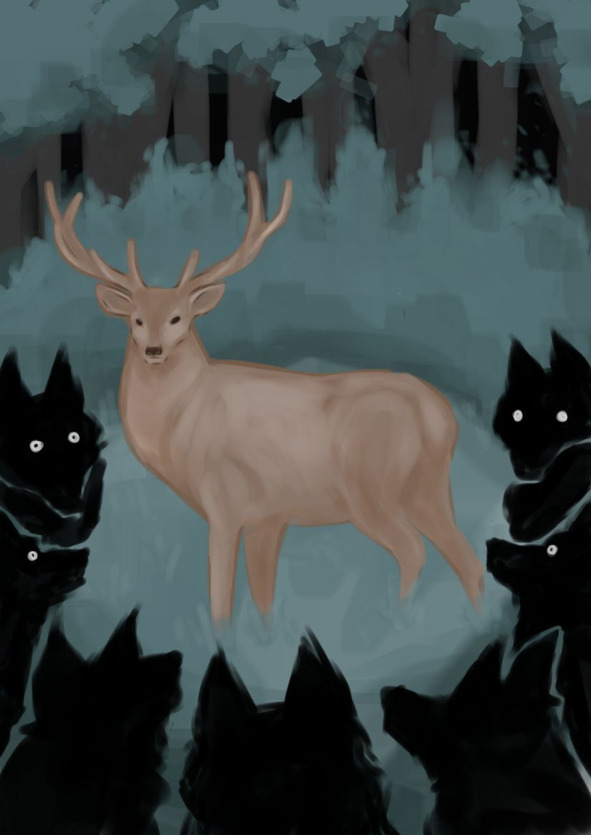 Вожак лежал на подстилке из мха и листвы в ожидании пиршества. Когда из-за деревьев появились олени, волк понял, что что-то не так. Их было множество, а вёл их олень со сверкающими золотом рогами. Вожак с трудом узнал юного короля – так велик и грозен он стал.