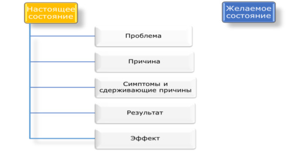 Анализ ресурсов, предшествующих причин, анализ симптомов и сдерживающих причин; проработка настоящего и формальных причин для достижения эффекта в ближайшем будущем, разбор конечных причин.