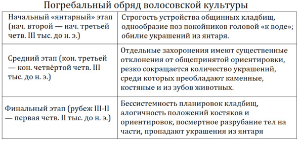 В большинстве энеолитических (волосовских) погребений тела покойников преднамеренно расчленены и изувечены, вероятно в ритуальных целях, судя по характеру и локализации повреждений, у брошенных в могилу тел перерезались основные двигательные мышцы. В одном погребении вместо головы покойника лежал большой валун. Также имеются захоронения, в которых тела рядами уложены друг на друга. Но самое интересное – это отсутствие коллагена в костях некоторых погребённых, что бывает при варке, но по мнению ведущих исследователей в этой области Костылёвой Е. Л. и Уткина А. В., кости не варили, как коллаген мог исчезнуть из костей, для учёных остаётся загадкой.
