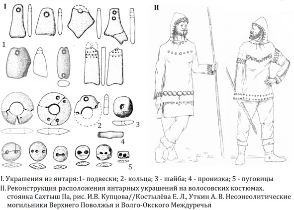 И, наконец, самыми интересными янтарными украшениями являются пуговицы-бляшки, их найдено большое количество, все разной формы и разного размера в основном с v или w-образными отверстиями, через которые они нашивались на одежду. По расположению пуговиц-блях в погребениях среди других украшений, учёным удалось частично реконструировать костюм древнего волосовца.
