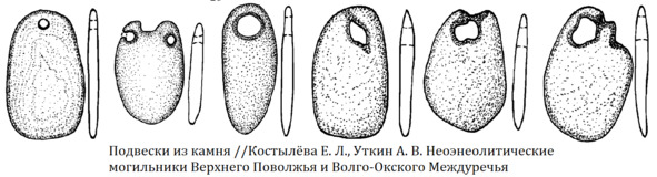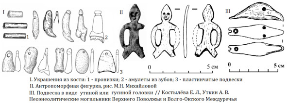 Вторым видом украшений являются костяные подвески, сделанные из тонких пластин и разнообразные по форме: под-трапециевидные, под-треугольные, под-прямоугольные, под-овальные, иногда вогнутые в основании. Погребения с костяными подвесками с вогнутым основанием занимают хронологическую нишу между ранними погребениями с янтарём и поздними – с серпентином.