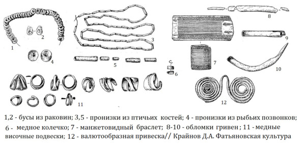 Уникальными являются валютообразные (очкообразные) привески из закрученной в спираль медной проволоки, найденные в Волосово-Даниловском, Никульцинском и Юрьевском могильниках в районе груди погребённых.