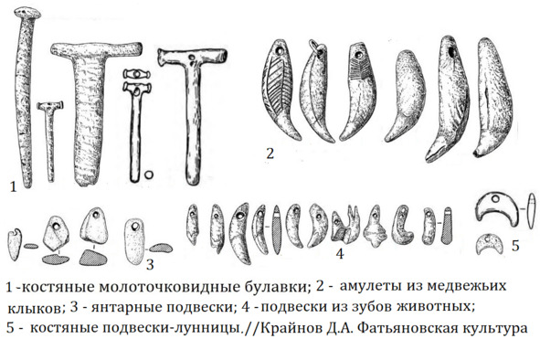 Чаще всего в фатьяновских погребениях встречаются подвески из костей животных с просверленными отверстиями. В Воронковском могильнике найдена костяная подвеска в виде лунницы со сверлиной, также встречаются подвески из янтаря и зубов животных, которые можно отнести к амулетам.