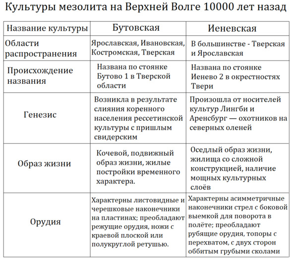 С отступлением ледников пришла эпоха мезолита. На всём Верхневолжье мезолитических стоянок около семидесяти, но все они представлены всего двумя культурами – бутовской и иеневской.