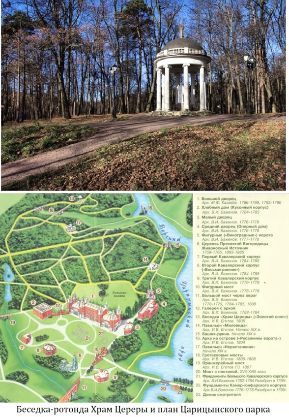 Если пойдете гулять по Царицынскому парку, проходя по мостику через реку Язвенку, обратите внимание на небольшую беседку-ротонду, стоящую на высоком холме правого берега Верхне-Царицынского пруда – это Храм Цереры, установленный в честь Екатерины II, которая с этого холма смотрела празднование сенокоса, но в прежние времена здесь находились несколько древних поселений разного времени, получившие общее название Царицыно-I «Церера», далее мы еще не раз вернемся к этой беседке. В 2000м году на этом месте был найден уникальный фрагмент керамики с текстильными отпечатками (культура поздней бронзы), с 2002го начались раскопки под руководством исследователя московских древностей Кренке Н. А., в результате которых на поселении Царицыно-1 «Церера» были обнаружены материалы трёх основных периодов, которые мы и будем рассматривать в этой книге: