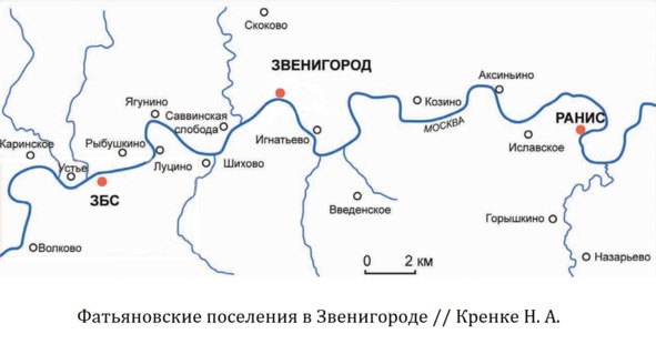 Первое поселение фатьяновской культуры было обнаружено в пойме на левом берегу Москвы-реки, у деревни Заозерье, возле Боровского перевоза, но оно почти не исследовалось. Следующими существенными открытиями стали раскопки поселений у Царицыно 1 «Церера», ЗБС-5 (Звенигородская биологическая станция), Акатово городского округа Клин, самым изученным является поселение РАНИС-пойма, расположенное на правом берегу Москвы-реки, напротив поселка Николина гора (РАНИС) в Одинцовском городском округе. Раскопки проводились известным московским археологом Н. А. Кренке, который смог восстановить первые жилища фатьяновцев в виде наземных построек, возможно, шатрового типа со следами очагов в виде пятен прокала, прослеженных вдоль линии берега.