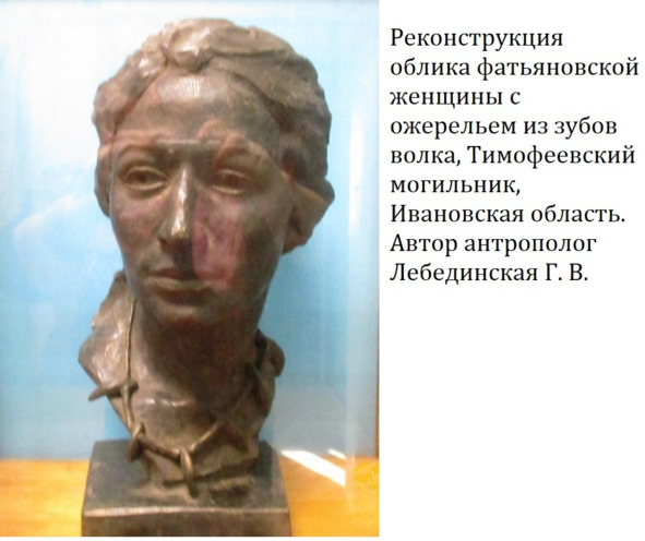 По черепу женского погребения большого Тимофеевского могильника, исследованного Верхне-Волжской экспедицией под руководством профессора Крайнова Д. А. в 1959м году, антрополог Лебединская Г. В. воссоздала облик древней фатьяновки с ожерельем из зубов волка.